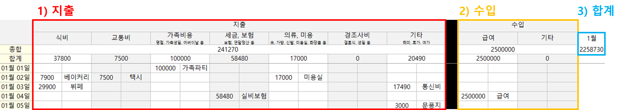 처음에는 아래와 같이 지출을 식비, 교통비, 기타지출로만 나누었다가