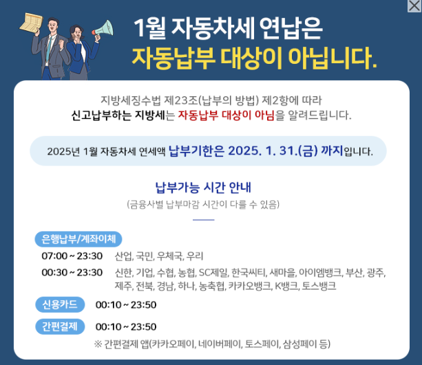 - 자동차세 연납은 자동이체가 불가능해요.